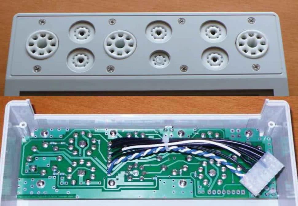 Przed montażem płytki, należy w obudowie wytrasować punkty pilotujące pod podstawki, wykorzystując do tego otwory mocujące płytkę oraz umieszczone centrycznie w każdej podstawce otwory 1 mm. Najlepiej w tym celu ułożyć płytkę na obudowie, nawiercić dwa skrajne otwory M3, przykręcić płytkę do obudowy i pozostałe otwory wywiercić małą wiertarką do płytek drukowanych. Następnie płytkę odkręcić i rozwiercić otwory do wymaganych średnic. Po tej czynności, należy wlutować elementy SMD i podstawki pod lampy. Należy jednak przylutować tylko po dwa skrajne piny, aby podstawki nie wypadały z płytki, wkręcić w otwory kołki dystansowe o długości 8…10 mm. Tak przygotowana płytkę należy zamocować do obudowy oraz skorygować położenie podstawek, tak aby były w jednej płaszczyźnie z obudową. Jeżeli wszystko pasuje i nie wymaga dalszych korekt, można przylutować wszystkie nóżki podstawek lamp. Następnie, krótkimi odcinkami przewodu izolowanego, łączymy złącze J z gniazdami bananowymi, przewidzianymi do wyprowadzenia napięć z miernika. Do złącza J0 należy dolutować wiązkę przewodów zakończoną wtykiem KK10_396 doprowadzoną do płyty głównej miernika. W górnej części płytki przewidziano złącze 6,3 mm służące do połączenia masy miernika z przewodem ochronnym sieci, które należy bezwzględnie dołączyć do styku ochronnego gniazda zasilania.