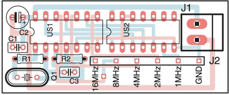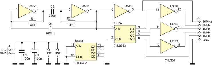 Z wyjścia bramki US1B jest pobierany sygnał dla licznika modulo 16, który jest zawarty w układzie US2. W ten sposób wytwarzane są pozostałe cztery sygnały, kolejno: 8 MHz, 4 MHz, 2 MHz i 1 MHz. Bramki US1C…US1F służą za bufory, izolujące wyjścia przerzutnika oraz obwodu generatora od wyjść. Wyjście QD układu US2A pozostaje niebuforowane. Kondensatory C1 i C2 filtrują napięcie zasilające.