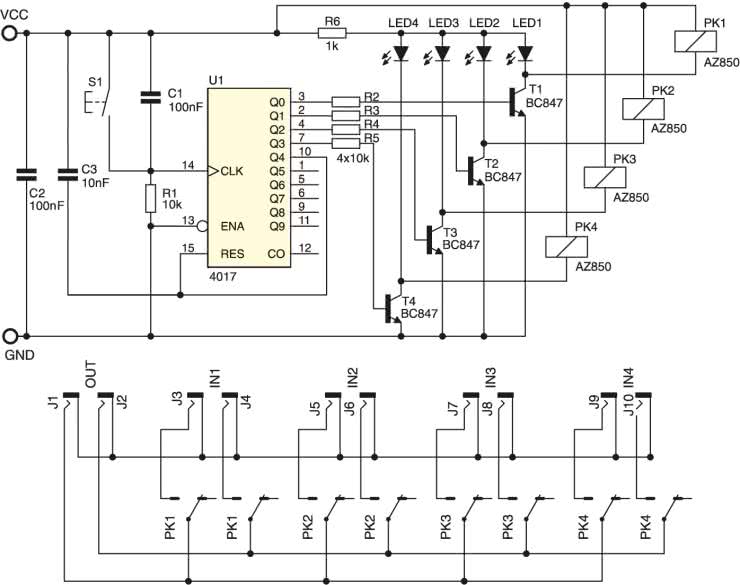W roli elementów przełączających zastosowano przekaźniki, a wyboru źródła sygnału wejściowego dokonuje się za pomocą przycisku. Pracą układu steruje popularny układ 4017 zawierający w swej strukturze licznik dziesiętny. Cykl zliczania został skrócony do czterech stanów przez połączenie wyjścia Q3 z wejściem RES. Kondensator C1 eliminuje drgania styku przycisku S1 mogące powodować niekontrolowaną pracę układu. Każde naciśnięcie przycisku S1 to podanie impulsu na wejście zliczające CLK, które wywołuje zmianę stanu licznika, a w konsekwencji przełączenie kolejnego przekaźnika.
