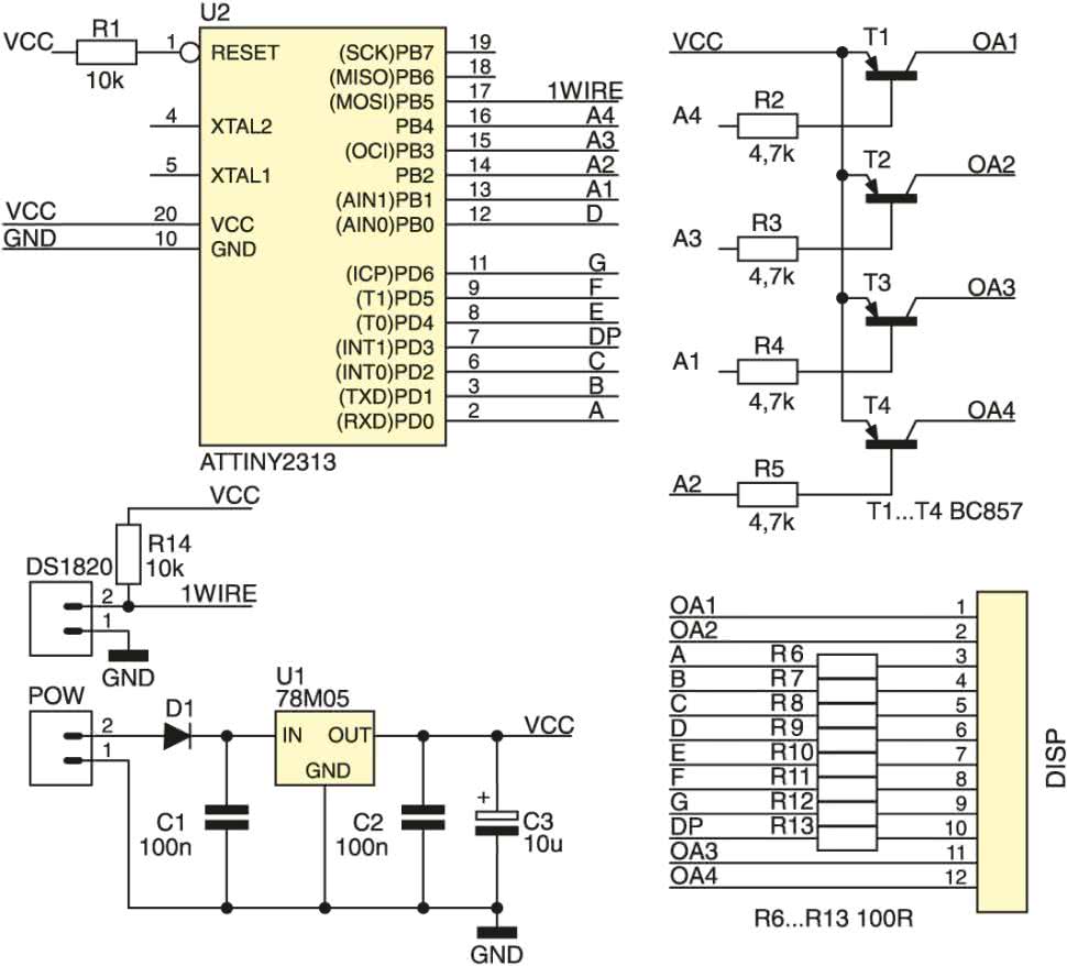 Układ powinien być zasilany napięciem stałym o wartości 7...15 V dołączonym do złącza POWER. Dioda D1 zabezpiecza go przed niewłaściwą polaryzacją napięcia wejściowego, natomiast kondensatory C1, C2 i C3 pełnią rolę filtra zasilania. Zewnętrzne napięcie wejściowe jest podawane na stabilizator U1. Pracą termometru steruje mikrokontroler ATTINY2313 taktowany wewnętrznym sygnałem zegarowym, natomiast rolę czujnika temperatury pełni układ typu DS1820/18S20/18B20. Wyświetlacze zostały opracowane w dwóch wersjach gabarytowych, natomiast ich sterowanie odbywa się identycznie. Anody wyświetlaczy zasilane są poprzez tranzystory T1...T4, natomiast katody są sterowane bezpośrednio z portu mikrokontrolera poprzez rezystory ograniczające R6...R13.