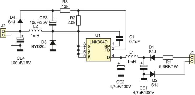 Zaprojektowano go na podstawie aplikacji układu scalonego LNK304D. Sieciowe napięcie zasilania, poprzez prostownik diodowy zbudowany z D1 i D2 oraz filtr złożony z kondensatorów CE1 i CE2 oraz dławika L1, jest doprowadzone do przetwornicy obniżającej napięcie. Za przetwarzanie energii zasilania odpowiedzialny jest obwód dławik L2 – dioda D3 – kondensator CE4 oraz klucz w układzie U1. Napięcie wyjściowe jest ustalane za pomocą dzielnika R3/R2 włączonego w pętli sprzężenia zwrotnego. Rezystor R1 pełni funkcje bezpiecznika (wymóg niepalności). Dla poprawnej pracy przetwornicy jest konieczne wstępne obciążenie. Jeżeli zasilany układ nie pobiera prądu o natężeniu min. 3 mA, to jest konieczne wstępne obciążenie rezystorem 3,3 kΩ.