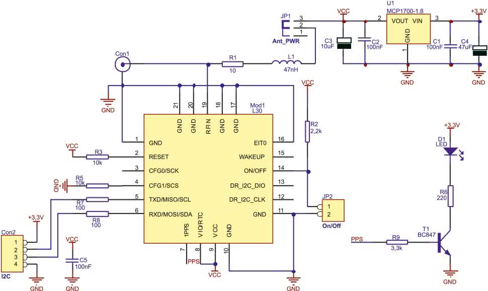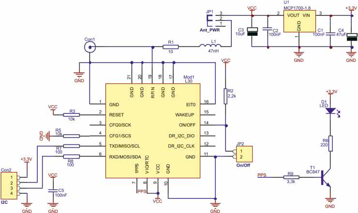 Dane przesyłane przez odbiornik L30 są dostępne na złączu Con2, które służy także do dostarczania zasilania (3,3 V, ok. 45 mA + prąd pobierany przez aktywną antenę, jeżeli jest zasilana). Napięcie zasilające odbiornik jest stabilizowane przez stabilizator LDO U1.