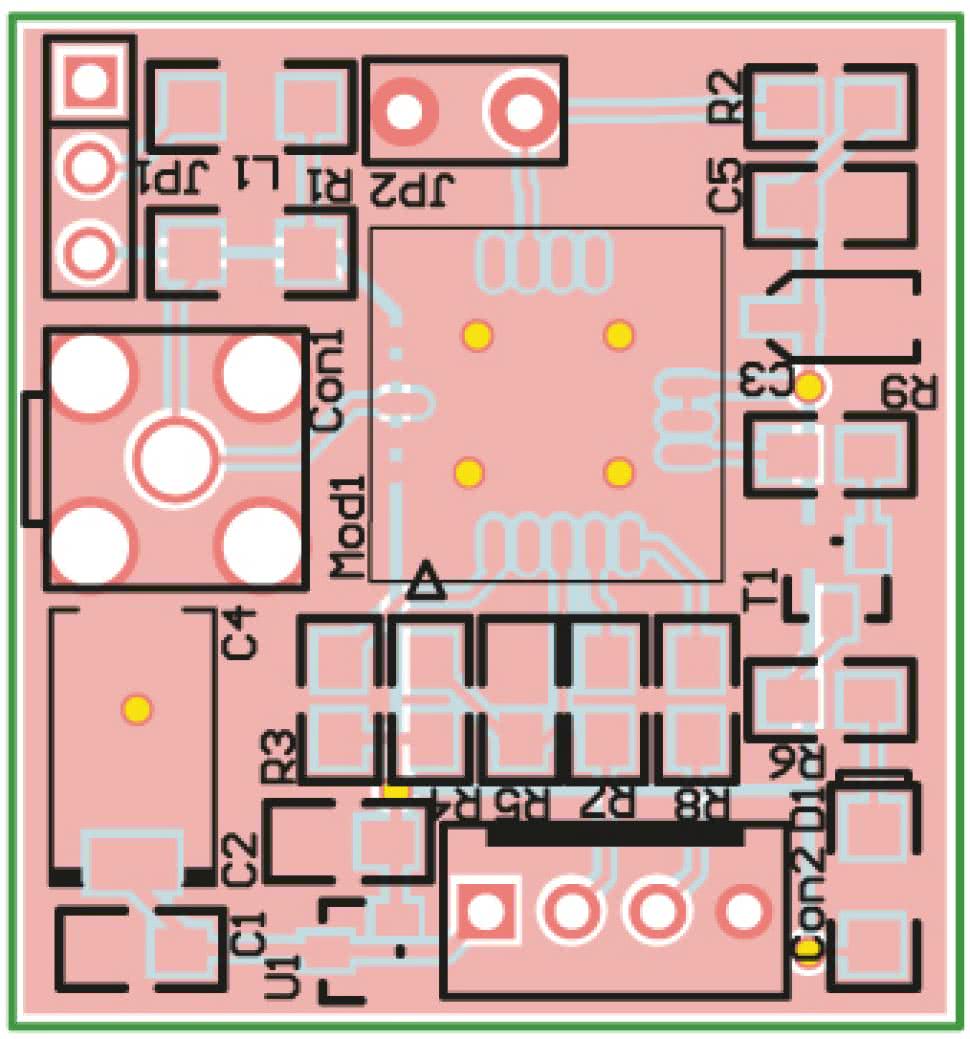 Odbiornik zmontowano na dwustronnej płytce drukowanej z metalizacją otworów, której schemat montażowy pokazano na rysunku 3.