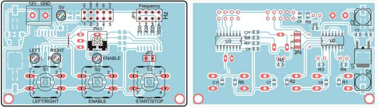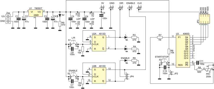 Sygnały wyjściowe są pobierane z wyjść 4 najmłodszych bitów licznika U3. Następnie sygnał wyjściowy jest wybierany za pomocą zworki JP3. Do nóżki 12 (RESET) dołączono przycisk umożliwiający włączenie generowania sygnałów oraz zworkę JP2, dzięki której jest możliwe włączenie generatora na stałe. Kondensatory C6, C7 i C10 filtrują drgania styków włączników. Włączenie/wyłączenie sygnałów DIR oraz ENABLE rozwiązano stosując układ 4013 zawierający dwa przerzutniki typu D. Dzięki temu jest możliwa zmiana poziomu sygnału za pomocą przycisków monostabilnych – każde ich przyciśnięcie zmienia stan sygnału na przeciwny. Do wyjść Q oraz NQ układu U2A dołączono diody LED „L” i „R” sygnalizujące kierunek obrotów silnika, natomiast sygnały wyjść Q oraz NQ układu U2B podane są na zworkę JP4, dzięki której jest możliwe ustawienie lub wyzerowanie sygnału ENABLE aktywującego sterownik (do sygnalizowania poziomu sygnału służy dioda LED ENABLE).