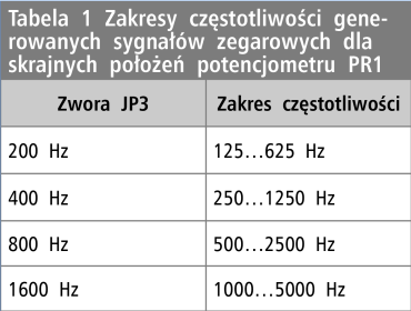 Sercem generatora jest układ 4060 wytwarzający sygnał taktujący sterownik silnika. Częstotliwość generowanego sygnału ustalają kondensator C11, rezystor R7 i sumaryczna wartość rezystancji R8+PR1. Dobrano je w taki sposób, aby zależnie od położenia zwory JP3 uzyskać sygnały o częstotliwościach 200 Hz, 400 Hz, 800 Hz oraz 1600 Hz. Pozwalają one na uzyskanie tej samej prędkości obrotowej wału silnika przy ustawionym mikrokroku o współczynniku podziału przez 1, 2, 4 oraz 8. Zmieniając wartości elementów generatora można uzyskać własne zakresy wytwarzanych częstotliwości, natomiast różne kombinacje ustawienia podziału w sterowniku oraz wyboru zakresu zworką JP3 umożliwiają uzyskanie różnych prędkości obrotowych wału. Zakresy częstotliwości sygnałów generowanych w prototypie dla elementów o wartościach podanych na schemacie umieszczono w tabeli 1.