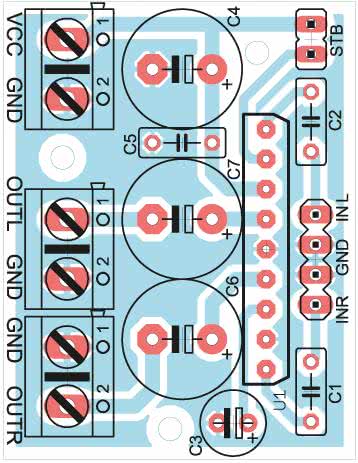 Kondensator C3 filtruje wewnętrzne napięcie odniesienia, natomiast kondensatory C4 i C5 filtrują napięcie zasilania, które powinno zawierać się w przedziale 6...16 V DC. Zworka STB pozwala na włączanie i wyłączanie wzmacniacza będącego cały czas pod napięciem. Udogodnieniem wynikającym z takiego rozwiązania jest brak konieczności stosowania wyłączników o dużej obciążalności prądowej.