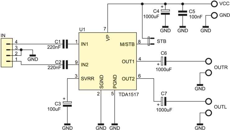 Na rysunku 1 pokazano schemat ideowy modułu. Układ wzmacniacza TDA1517 zawiera zabezpieczenia przeciwzwarciowe i termiczne. Sygnał wejściowy dostarczany do wzmacniacza jest podawany przez kondensatory C1...C2. Zapobiegają one przedostawaniu się na wejście końcówki mocy składowej stałej.