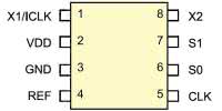 ICS512 jest przewidziany do pracy w rozszerzonym zakresie temperatur (-40 do +85 C) i jest zamykany w obudowie SOIC 8 pin (rzadziej występuje w innych obudowach), a rozkład wyprowadzeń ilustruje rysunek 2. Układ może współpracować z rezonatorem kwarcowym o częstotliwości od 5 do 27 MHz, a przy doprowadzeniu sygnału z zewnętrznego źródła, jego częstotliwość może zawierać się w zakresie od 2...50 MHz. Według danych katalogowych maksymalna częstotliwość wyjściowa układu wynosi 200 MHz, a napięcie zasilania 3...5,5 V ze średnim poborem prądu 20 mA).