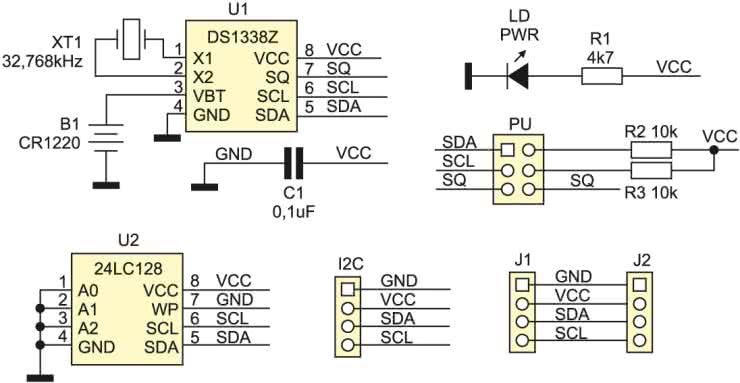 Za realizację funkcji RTC odpowiada układ U1 (DS1338Z) będący funkcjonalnym odpowiednikiem DS1307, ale o rozszerzonym zakresie napięcia zasilania – od 3 do 5 V, co ułatwia łączenie z nowoczesnymi układami zasilanymi niskim napięciem. Układ U1 współpracuje z oscylatorem kwarcowym Q1 oraz baterią podtrzymującą pracę po zaniku zasilania głównego. Ze względu na niewielki pobór prądu zastosowano miniaturową baterię litową typu CR1220, w miejsce dużo większej CR2032, co umożliwiło zmniejszenie wymiarów modułu. Oprócz układu U1 na płytce znajduje się pamięć EEPROM (24LC128), również przystosowana do pracy w rozszerzonym zakresie zasilania. Dodatkowo, płytka ma złącze PU umożliwiające zasilenie magistrali I²C, wyprowadzenie wyjścia SQ generatora układu U1 oraz diodę sygnalizującą załączone napięcie zasilania.