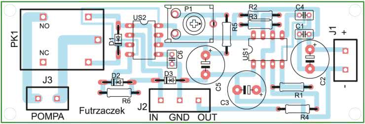 Schemat montażowy włącznika pompy pokazano na rysunku 2. Zmontowaną płytkę należy zabezpieczyć przed wilgocią. Elektrody dołączane są, za pośrednictwem przewodów, do skrajnych zacisków złącza J2. Zaleca się użycie przewodu ekranowanego – ekran jest dołączany zacisku środkowego, połączonego z masą układu. Dobrym materiałem na elektrody są pręciki grafitowe pochodzące z ołówka lub elektrod grafitowych do spawania. Umieszczone powinny być możliwie blisko siebie, ale tak, by nie było możliwe ich zetknięcie się. Zamocować je należy na izolatorze, wykonanym np. pleksiglasu.