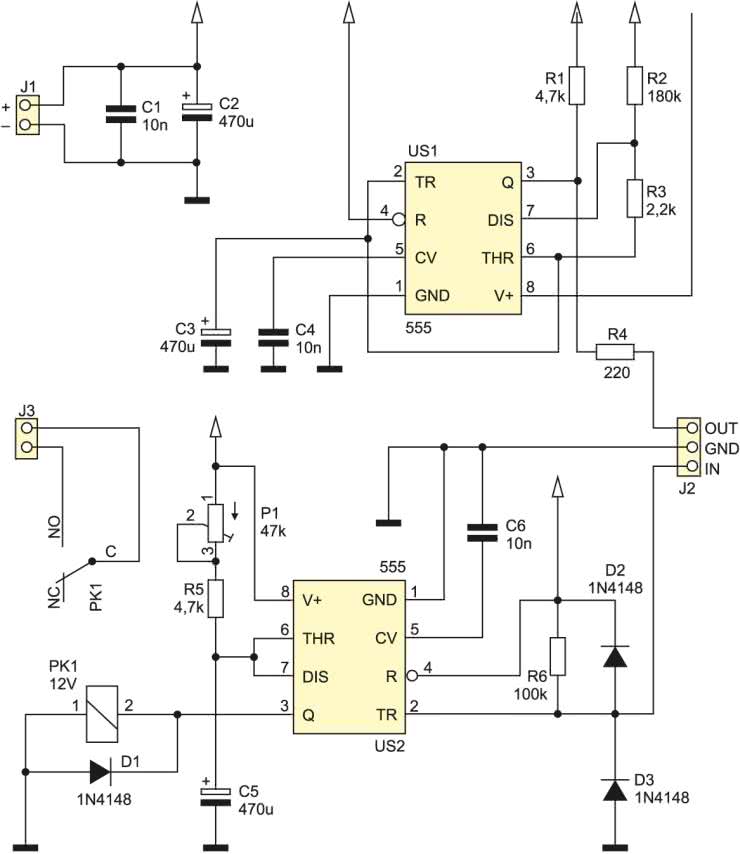 Druga elektroda jest dołączona do wejścia wyzwalającego układu US2, który to pracuje w konfiguracji multiwibratora monostabilnego: niski poziom logiczny na jego wejściu powoduje załączenie przekaźnika PK1 na czas określony wartościami elementów R5, P1 i C5. Rezystor R6 utrzymuje wejście na poziomie wysokim, co zapobiega przypadkowemu wyzwoleniu uniwibratora. Diody D2 i D3 zabezpieczają wejście przed przepięciami. Zadaniem diody D1 jest ochrona wewnętrznego tranzystora przed przebiciem spowodowanym napięciem wyindukowanym w cewce PK1 podczas jej wyłączania.