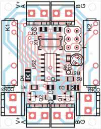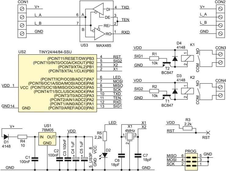 Pracą układu steruje mikrokontroler ATtiny24, który zapewnia odpowiednią liczbę linii I/O i jest dostępny w małej obudowie SO14. Interfejs UART został zrealizowany programowo i pracuje z parametrami: 9600, n, 8, 1. Schemat ideowy modułu pokazano na rysunku 1, natomiast montażowy na rysunku 2. Rolę wyjść pełnią przekaźniki o obciążalności styków do 3 A, (do 230 V AC lub 30 V DC). Moduł powinien być zasilany z napięcia 7...15 V DC, maksymalny pobór prądu wynosi ok. 60 mA.