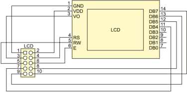 Podstawowym wyświetlaczem, który może być używany z modułem jest wyświetlacz znakowy, zgodny z HD44780. Do dołączenia wyświetlacza służy złącze LCD, potencjometr RV umożliwia ustawienie kontrastu. Niestety, ze względu na niedostępność wyświetlaczy sterowanych napięcie 3 V mieszczących się na płytce, konieczne jest wykonanie taśmy połączeniowej pomiędzy złączem LCD, a modułem wyświetlacza. Schemat połączeń pokazano na rysunku 2. Wyświetlacz jest obsługiwany przez bibliotekę LiquidCrystal.h.