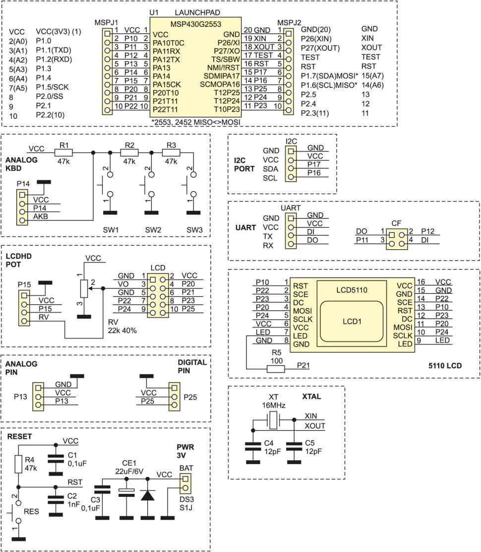 Klawiaturę wykonano jako analogową, czyli sterowany przyciskami SW1…SW3 rezystorowy dzielnik napięcia (R1, R2, R3). Do odczytu wartości napięcia używany port P14 (A4), aby umożliwić odczyt jest konieczne założenie zwory na wyprowadzenia 3-4 złącza P14. Jeżeli nie korzystamy z klawiatury, zwora może być zdjęta. Można wtedy korzystać z wejścia analogowego dla innych celów. Niewykorzystane wyprowadzenia Launchpada wyprowadzone są na złącza zgodne z Arduino Sensor. Do dyspozycji jest port analogowy P13(A3), cyfrowy P25 (13), magistrala I²C oraz interfejs szeregowy UART z możliwością zmiany sygnałów RX na TX i TX na RX za pomocą zworek CF (różnice wynikają z realizacji programowej/sprzętowej UART w procesorach G2).
