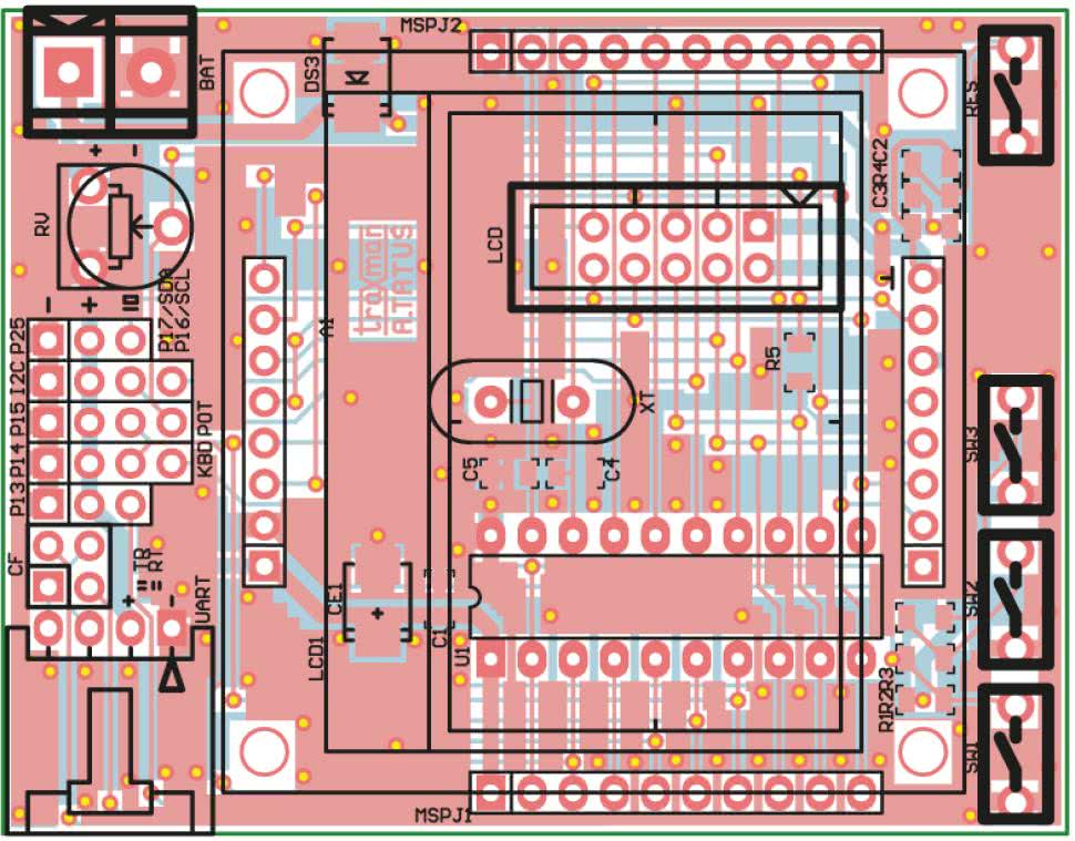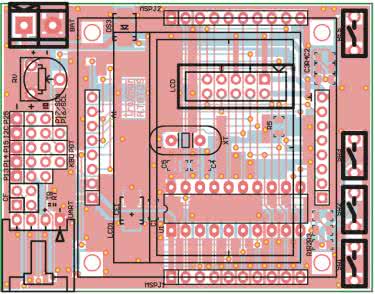 Jak wspominałem, płytka może pracować samodzielnie. W tym celu umieszczono na niej gniazdo DIP20 (U1). Dla poprawnej pracy konieczne jest uzupełnienie układu o obwód RESET C2/R4/RES oraz o opcjonalny generator zegarowy złożony z kondensatorów C4 i C5 oraz rezonatora XT1. Polecam w tym wypadku montaż żeńskich złącz MSPJ1 i MSPJ2. Wtedy po włożeniu procesora do płytki LCD jest możliwe użycie Launchpada tylko w roli programatora. Po zaprogramowaniu można płytkę wyjąć i używać samodzielnie, oczywiście po zapewnieniu zasilania.