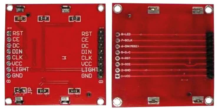 Drugim typem obsługiwanego wyświetlacza jest wyświetlacz graficzny zgodny z Nokia 5110, ze sterownikiem PCF8544. Jest to popularny moduł dostępny na aukcjach internetowych. Moduł składa się z wyświetlacza oraz elementów podświetlenia, a wszystkie sygnały sterujące dostępne są na typowym złączu SIL. Niestety, aby nie było zbyt łatwo, moduły dostępne są z różnym przypisaniem funkcji wyprowadzeń. Różnice pokazano na fotografii 3. Aby możliwe było wykorzystanie obu wersji, płytka ma powielone złącze wyświetlacza.