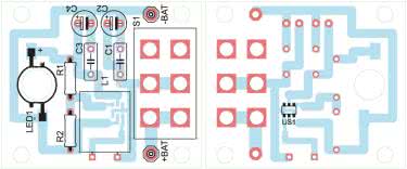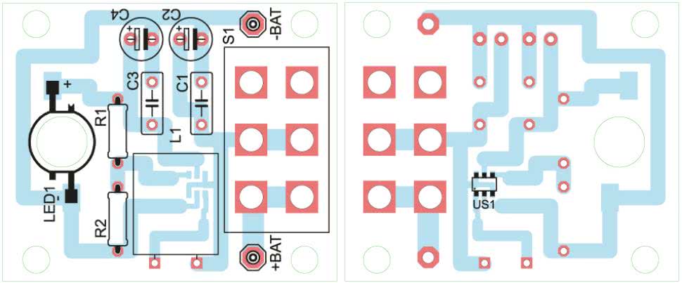 Układ latarki zmontowano na jednostronnej płytce drukowanej o wymiarach 33 mm×39 mm, której schemat montażowy pokazano na rysunku 2. Przystępując do montażu, w pierwszej kolejności należy przylutować układ scalony US1, natomiast na końcu diodę LED i wyłącznik. Jako C2 i C4 warto zastosować kondensatory tantalowe, ze względu na mniejsze gabaryty i większą trwałość.