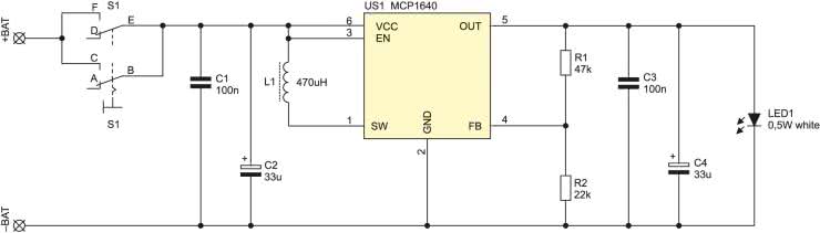 Schemat latarki pokazano na rysunku 1. Ponieważ diody świecące w kolorze białym potrzebują napięcia ok. 3,5 V, a siła elektromotoryczna ogniwa wynosi ok. 1,5 V, konieczne było zastosowanie niewielkiej przetwornicy. Została ona zrealizowana w oparciu o układ scalony MCP1640 firmy Microchip. Głównymi jego zaletami są: dostępność w handlu detalicznym, stosunkowo niska cena (ok. 4 zł brutto za sztukę), małe wymiary i łatwość montażu (obudowa SOT23-6), mała liczba wymaganych elementów dodatkowych (kondensatory, dławik i rezystory w pętli sprzężenia zwrotnego). Co ważne, strat przetwornicy następuje już od 0,65 V – oznacza możliwość zasilania nawet z bardzo rozładowanej baterii.