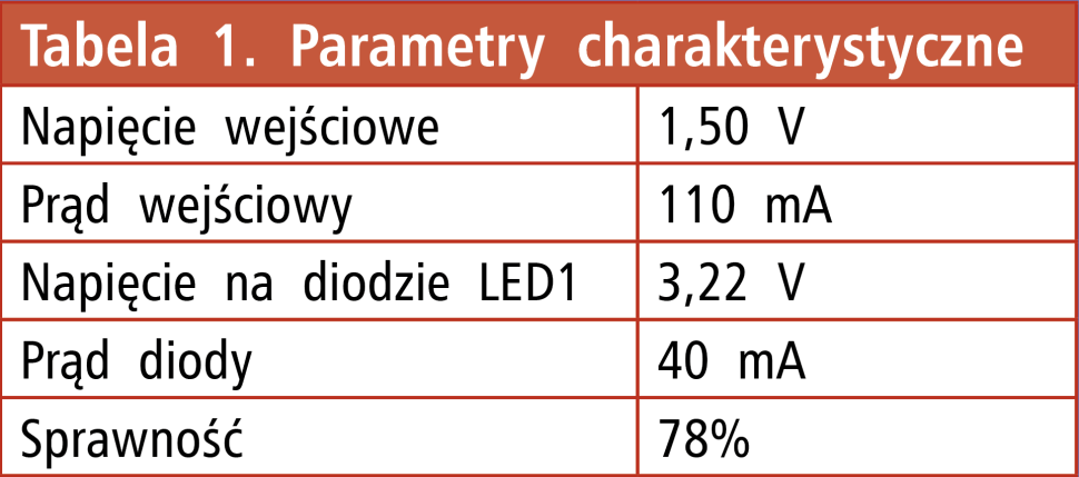 Na drodze eksperymentalnej dobrano takie wartości elementów, by uzyskać możliwie dużą wydajność świetlną przy małym poborze prądu. Charakterystyczne prądy i napięcia umieszczono w tabeli 1. Przy nominalnej pojemności baterii cynkowo-węglowej na poziomie 8000 mAh (Wikipedia), powinno to wystarczyć na ok. 70 godzin pracy.