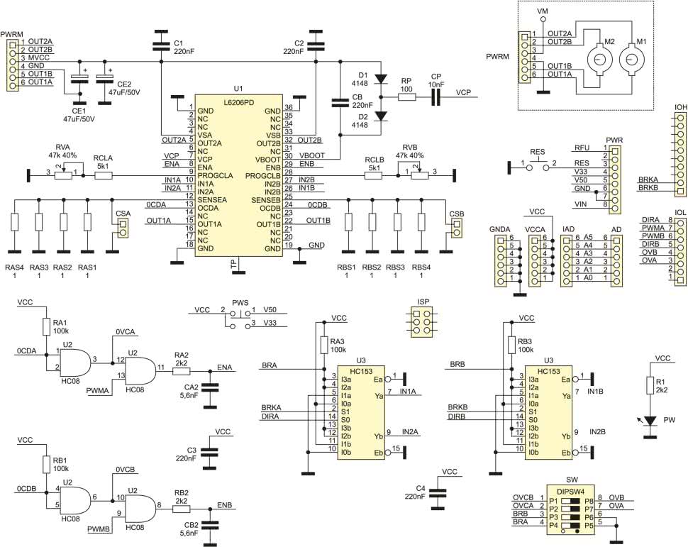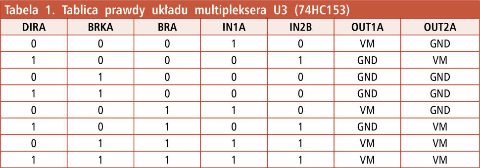 Do ustawienia dokładnej wartości prądu zabezpieczenia służy potencjometr RVA. Rezystor RCLA ustawia wstępnie maksymalny próg zadziałania. Zadziałanie zabezpieczenia przeciążeniowego jest sygnalizowane wyzerowaniem wyjścia (otwarty dren) OCDA wstępnie zasilanego przez rezystor RA1. Bramka AND (U2-1) buforuje sygnał przerwania OVCA, który poprzez przełącznik DIP SW2-2 jest doprowadzony do złącza IOL. Przerwanie może być „odłączone” SW2-2, jeśli nie będzie używane przez kontroler, „uwalniając” piny dla innych zastosowań. Sygnał przerwania OVCA poprzez bramkę U2-3 blokuje wysterowanie sygnałem PWM wejścia sterującego U1-ENA. Powoduje to wyłączenie mostka H przy przeciążeniu. Sterowanie silnikiem odbywa się przez sygnały kierunku DIRA, zezwolenia PWMA oraz hamowania BRKA (wszystkie sygnały aktywne na poziomie wysokim). Przełącznikiem SW-4 zadajemy sygnał BRA określający sposób hamowania silnika. Sygnały doprowadzone są do multipleksera U3-HC153 pełniącego funkcję transkodera. Funkcje realizowane przez U3 określa tabela 1.