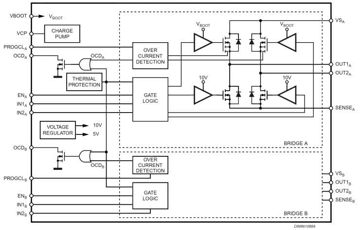 Schemat modułu pokazano na rysunku 1. Sercem AVTDuinoDCMotor jest U1, specjalizowany sterownik-driver L6206 firmy ST. Układ zawiera wszystkie niezbędne dla sterowania silnikiem obwody (rysunek 2): mostek H z tranzystorami MOSFET o małej Rdson, zintegrowaną przetwornicę podwyższającą napięcie dla bramek mostka H, niewymagający zewnętrznych elementów układ monitorowania prądu i detekcji przeciążenia, o możliwości ustawienia wartości progowej oraz układ logiki sterującej z zabezpieczeniami.