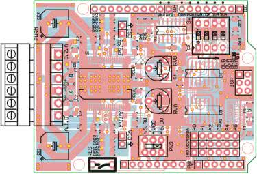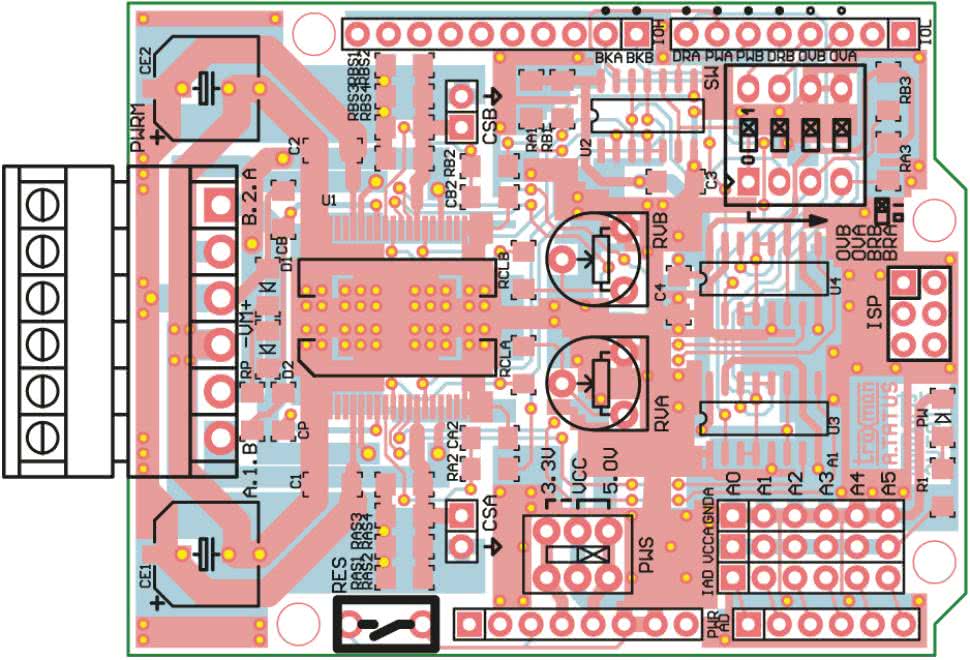Przełącznik PWS umożliwia wybór napięcia zasilającego logikę pomiędzy 3,3 V, a 5 V zależnie od wymogów płytki bazowej. Złącze ISP jest opcjonalne, moduł nie wykorzystuje jego sygnałów, należy je wlutować, gdy zamierzamy „kanapkować” płytki rozszerzeń dla zachowania pełnej zgodności z Rev3 Arduino. Silniki i zasilanie doprowadzone są do płytki rozłączanym złączem śrubowym MC. Układ zmontowano na dwustronnej płytce drukowanej. Rozmieszczenie elementów pokazano na rysunku 4.