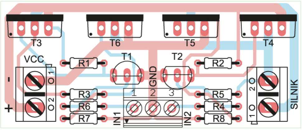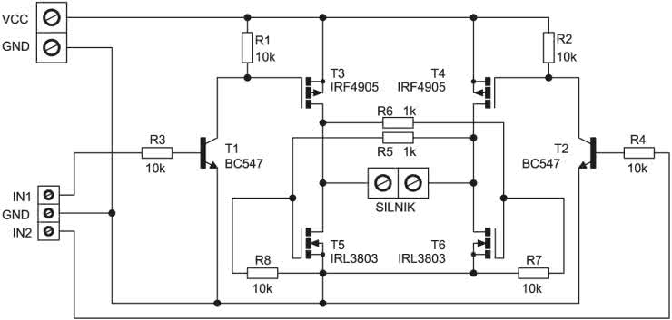W proponowanym rozwiązaniu elementami wykonawczymi, bezpośrednio zasilającymi dołączony do układu silnik, są cztery tranzystory MOSFET pracujące w układzie mostka, w którego przekątnej został włączony silnik. Pojawienie się poziomu wysokiego na wejściu IN1 spowoduje spolaryzowanie tranzystora T1, a w konsekwencji jednoczesne włączenie tranzystorów T3 i T6 oraz obrót silnika w jednym kierunku. Podobnie spolaryzowanie bazy tranzystora T2 wywoła włączenie tranzystorów T2 i T5 oraz obrót silnika w kierunku przeciwnym.