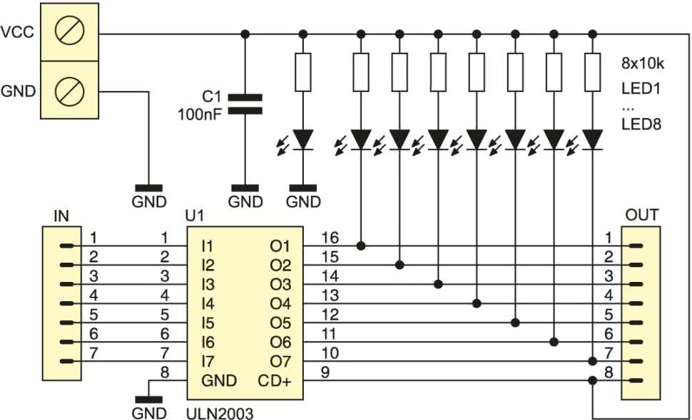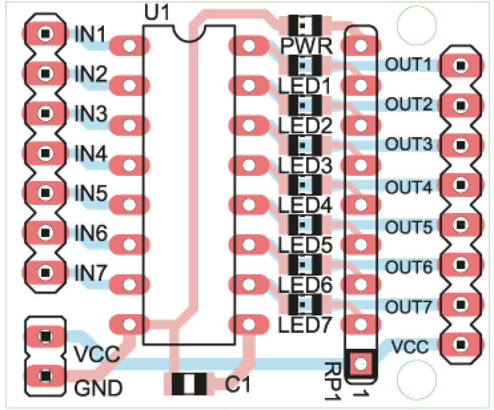Za pośrednictwem układu ULN2003 można sterować obciążeniami wymagającymi prądu zasilania do 0,5 A i zasilanych ze znacznie wyższego napięcia, niż układy sterujące jego pracą. Diody LED1...LED7 zostały dołączone bezpośrednio do wyjść układu i informują o tym, które z nich jest aktualnie aktywne (przewodzi prąd). Układ należy zmontować na płytce drukowanej pokazanej na rysunku 2.