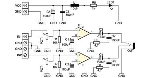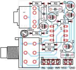 Układ pracuje poprawnie w zakresie napięć zasilania już od 1,8 V aż do 15 V DC, a moc oddawana do obciążenia wynosi około 650 mW (przy napięciu 12 V i słuchawkach o oporności 32 Ω). Sygnał wejściowy pochodzący ze złącza IN trafia na potencjometr regulacji głośności POT1, a dalej do układu U1. Sygnał wyjściowy jest podawany poprzez kondensatory separujące C3 i C4 na złącze wyjściowe Mini-Jack, do którego bezpośrednio dołączamy słuchawki. Dioda LED1 informuje o załączeniu napięcia zasilania.