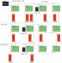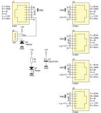 Rozgałęziacz składa się z pięciu gniazd RJ- 12. Jego schemat ideowy pokazano na rysunku 1. Linie transmisji danych oraz zasilania są połączone równolegle. W trybie pasywnym (bez przyłączonego dodatkowego zasilacza) masa wszystkich gniazd jest połączona równolegle. W takiej sytuacji wszystkie gniazda mogą pełnić dowolną funkcję. Dioda LED informuje o obecności napięcia zasilającego manipulatory. Jeśli istnieje konieczność zasilenia części manipulatorów z dodatkowego zasilacza, jego wtyczkę umieszczamy w gnieździe J2 (plus na zewnętrz). Styki tego złącza odizolują masę gniazda J1, dzięki czemu zasilacz będzie przyłączony tylko do gniazd J3...J6 i zasili manipulatory do nich przyłączone. Dioda D1 zabezpiecza magistralę przed zamieniona biegunowością zasilania na wtyczce zasilacza. Różne sposoby włączenia ekspandera pokazano na rysunku 2.