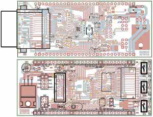Moduł zmontowany jest na dwustronnej płytce drukowanej, której schemat montażowy pokazano na rysunku 2. Rozstaw złącz krawędziowych umożliwia montaż modułu w typowych płytkach stykowych lub prototypowych, sposób i strona montażu złącz zależy od preferencji i zastosowań. Osobiście preferuje długie złącza SIL i wlutowanie ich tak, aby wyprowadzenia były dostępne z obu stron płytki.