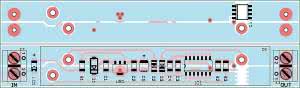 Schemat montażowy ściemniacza przedstawia rysunek 2. Montaż należy zacząć od wlutowania elementów SMD. Kolejnym krokiem będzie przylutowanie złączek śrubowych oznaczonych, jako IN i OUT. Ostatnim elementem będzie wlutowanie potencjometru suwakowego. Aby poprawić odprowadzanie ciepła ze stabilizatora US1 i tranzystora T1 na płytce zostały przewidziane pola, które powinno się dodatkowo pocynować. Podczas montażu należy zwrócić szczególną uwagę na sposób wlutowania elementów biegunowych: kondensatora C5, diod, tranzystora, stabilizatora oraz układu scalonego, którego wcięcie w obudowie musi odpowiadać rysunkowi na płytce drukowanej.