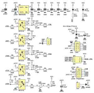 Ze względu na duże prędkości interfejsu JTAG zaleca się zastosowanie transoptorów 6N137-E pracujących do prędkości 10 MB/s (w AVR maksymalna prędkość JTAG wynosi teoretycznie 5 MB/s) ale godząc się z mniejszą prędkością, można zastosować transoptory 6N137 (1 MB/s). Podobnie jak w AVT-1770, użyto przetwornicy NME0505S, którą można zastąpić zasilaczem dołączonym do złącza J2.
