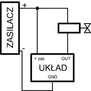 Napięcie zasilania układu powinno zawierać się w przedziale 12...35 V. Prąd "konsumowany" przez urządzenie nie przekracza 10 mA. Sterowany elektrozawór powinien być przystosowany do zasilania napięciem stałym, nie większym niż ok. 40 V, przy poborze prądu do ok. 4 A. Prawidłowy układ połączeń prezentuje rysunek 3 przy założeniu, że napięcie zasilania nie przekracza wartości maksymalnej dla układu 78L09.