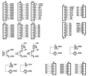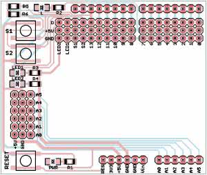 Takie rozwiązanie umożliwia montaż i uruchamianie własnych układów prototypowych lub zamontowanie dodatkowych elementów wykonawczych i dowolne ich połączenie z płytką bazową. Dodatkowo na potrzeby wykonania interfejsu użytkownika, płytkę wyposażono w 2 przyciski oznaczone jako S1 i S2. Stanem aktywnym przycisków jest poziom "0", a ich sygnały doprowadzone zostały na złącze szpilkowe J10.