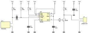 Elementem realizującym opisany multiwibrator monostabilny jest doskonale znany NE555. Jego wejście jest wyzwalane za pośrednictwem obwodu różniczkującego napięcie na zaciskach czujnika drgań. W ten sposób na wejście timera przenoszona jest jedynie informacja o zmianie ich stanu. Czas trwania impulsu jest ustalony przez wartości elementów R3 i C3. Tranzystor T1 jest wprowadzany w nasycenie, dlatego wartość stanu niskiego na wyjściu układu niemal pokrywa się z potencjałem masy.