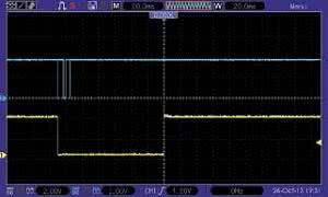 Rysunek 2 to oscylogram przedstawiający przebiegi na czujniku SW-520D (niebieski) i na wyjściu układu (żółty). Widać, że podłączenie czujnika bezpośrednio do mikrokontrolera mogłoby spowodować nieprawidłowe jego działanie, wywołane przez podanie na jego wejście serii impulsów szpilkowych o nieznanym wypełnieniu i czasie trwania. Dodanie dodatkowych elementów zapewnia wygenerowanie jednego impulsu o czasie trwania ok. 110 ms (w układzie modelowym - ok. 130 ms) z szybkim zboczem opadającym i niewiele wolniejszym zboczem narastającym.