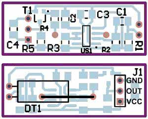 Układ zmontowano na jednostronnej płytce drukowanej o wymiarach 34 mm×12 mm, której schemat montażowy pokazano na rysunku 3. Montując elementy na płytce należy pamiętać również o zworce z drutu. Prawidłowo zmontowany układ działa od razu po włączeniu zasilania. Zasilanie napięciem z przedziału 3...12 VDC, pobór prądu (z nieobciążonym wyjściem) zawiera się w przedziale, odpowiednio, 2...10 mA.