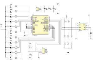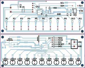 Schemat ideowy elektronicznego barometru pokazano na rysunku 1. Głównym układem sterującym jest popularny mikrokontroler ATmega8. Realizuje on komunikację z układem MPL115A2, oblicza wynik końcowy oraz prezentuje go na wyświetlaczu złożonym z 11 diod LED. Otoczenie tego układu jest typowe: obwód rezystor R12 - kondensator C5 gwarantuje prawidłowe uruchomienie mikrokontrolera po załączeniu zasilania, natomiast kondensatory C1 i C2 filtrują jego zasilanie.