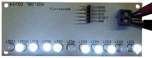 Po prawidłowym zaprogramowaniu, barometr jest natychmiast gotowy do eksploatacji, ponieważ nie wymaga od użytkownika kalibracji. Zasilanie napięciem 5 V, dobrze stabilizowanym. Pobór prądu jest silnie zależny od liczby załączonych diod i nie przekracza wartości 40 mA. Odczytywania wartości należy dokonywać w tym położeniu płytki, jaki prezentuje fotografia 3. Wartość ciśnienia atmosferycznego zakodowana jest w postaci naturalnego kodu binarnego: najbardziej na lewo znajduje się bit najstarszy (o wadze 210 = 1024), obok niego bit nieco młodszy (29 = 512) i tak dalej. LED1, umieszczona na prawo, sygnalizuje stan bitu najmłodszego (o wadze 20 = 1). Odczyt wartości (w postaci dziesiętnej) następuje poprzez zsumowanie wszystkich wag sygnalizowanym przez załączone diody. Dla przykładu ze zdjęcia, jest to: 0·210+1·29+1·28+1·27+1·26+0·25+1·24+ 1·23+1·22+0·21+1·20=512+256+12+64+ 16+8+4+1=989 hPa