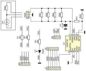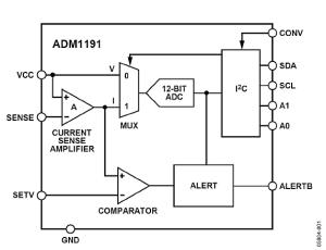 Układ ADM1191 ma konfigurowalny komparator wykrywający przekroczenie zadanej wartości prądu. Wyniki konwersji dostępne są przez interfejs I²C. Możliwość adresowania układu umożliwia rozbudowę do 16 układów pomiarowych dołączonych do pojedynczej magistrali. Schemat funkcjonalny układu przedstawia rysunek 1. Podstawowa aplikacja ADM1191 zawiera tylko jeden rezystor Rs konieczny dla pomiaru prądu. Schemat ideowy modułu pokazano na rysunku 2.