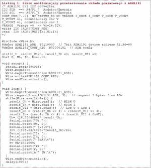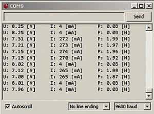 Przykładowy prosty szkic dla Energii/Arduino (Dla środowiska Energia wymagany Launchpad z procesorem 452/553) umożliwiający sprawdzenie poprawnego działania płytki przedstawia listing 1. Program realizuje ciągłą konwersję wartości napięcia i prądu oraz na ich podstawie oblicza moc. Wyniki przesyłane są do terminala znakowego 9600,8,N,1. Wynik działania szkicu pokazano na rysunku 5.