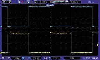 Rysunek 3. Przebieg czasowy napięcia przyłożonego do elektrody wspólnej (żółty) i wyłączonego segmentu (niebieski).