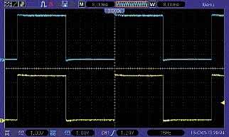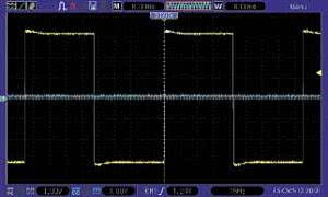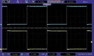 Z kolei, wyłączenie segmentu odbywa się poprzez podanie przebiegu o tej samej fazie, co zasilający elektrodę wspólną - rysunek 3. Sygnał przykładany różnicowo ma dwukrotnie większą amplitudę, zaś podawany współbieżnie wytłumia się i nie polaryzuje ciekłych kryształów. Objaśnia to oscylogram na rysunku 4.