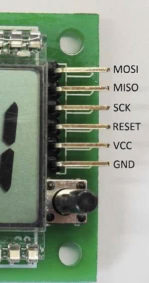 Do zaprogramowania mikrokontrolera poprzez ISP służy złącze J1. Kolejność wyprowadzeń w nim przedstawia fotografia 5. Zasilanie układu może odbywać się napięciem stałym, z przedziału 2,7...5,5 V, na przykład z baterii. Przedział ten jest określony przez zakres poprawnej pracy mikrokontrolera ATMega32L. Pobór prądu waha się od ok. 600 mA (VCC=3 V) do ok. 1,25 mA (VCC=5 V).