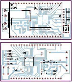 Licznik zmontowano na jednostronnej płytce drukowanej o wymiarach 38 mm×70 mm, której schemat montażowy pokazano na rysunku 6. Podczas montażu należy pamiętać o pięciu zworkach z drutu, nad którymi znajduje się wyświetlacz. Z kolei, sam wyświetlacz winien być zwrócony wystającą z krótszej krawędzi "spoiną" w stronę zacisków SUPPLY i INPUT na płytce.