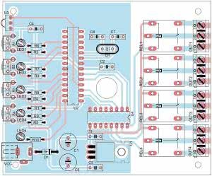 Schemat montażowy przełącznika pokazano na rysunku 2. Całość została zmontowana na dwustronnej płytce drukowanej o wymiarach 83 mm× 98 mm dopasowanej do obudowy KM35. Montaż układu rozpoczynamy od wlutowania w płytkę oporników i innych elementów o niewielkich rozmiarach, a kończymy montując kondensatory elektrolityczne przekaźniki i złącza śrubowe. Sterownik zmontowany ze sprawwnych elementów nie wymaga jakiejkolwiek regulacji i po zarejestrowaniu komend wysyłanych przez pilota jest gotowy do pracy.