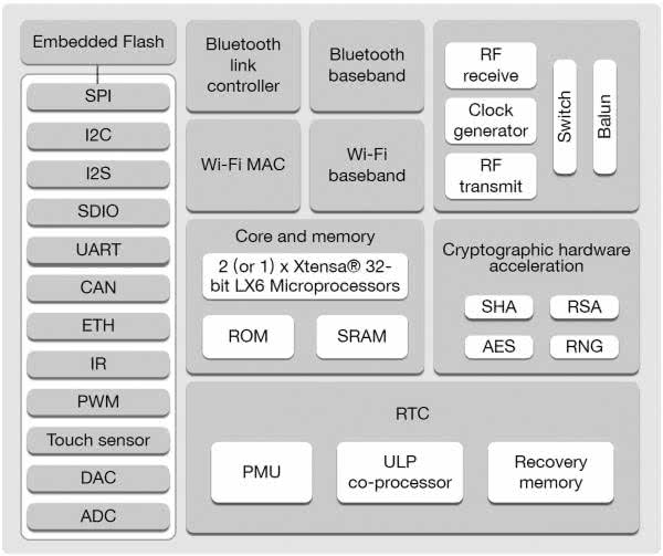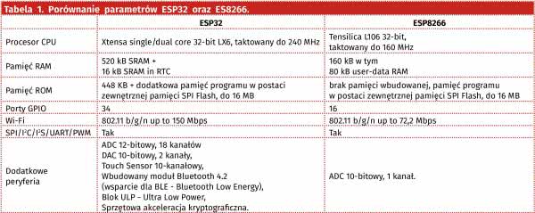 Podstawowe parametry układu ESP32 przedstawia tabela 1, dla porównania w tabeli umieszczono także parametry układu ESP8266. To oczywiste, że nowy układ jest szybszy i dysponuje większą pamięcią, ale najistotniejsze znaczenie mają dodatkowe peryferia, w które został wyposażony. Dzięki temu zmieniła się rola układu, już nie jest to tylko moduł komunikacji, teraz jest to samodzielny system. Dokładny schemat blokowy układu przedstawia rysunek 1.