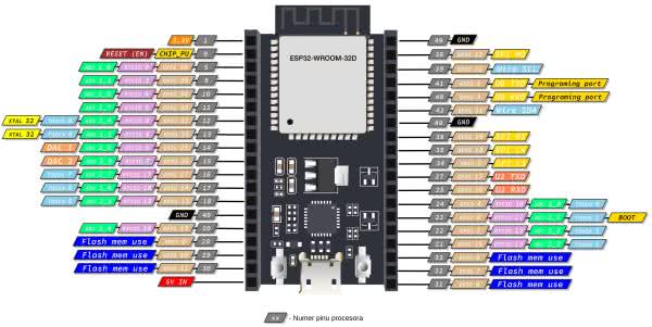 Dodatkowo płytka ma wyprowadzenia w postaci szpilek goldpin, dzięki czemu ułatwia budowę urządzeń prototypowych. Należy pamiętać, że układ ESP32 nie toleruje na wejściach napięcia wyższego od napięcia zasilającego - zatem do wejść nie wolno dołączać sygnałów o napięciu 5 V. Rysunek 2 przedstawia opis wyprowadzeń płytki.