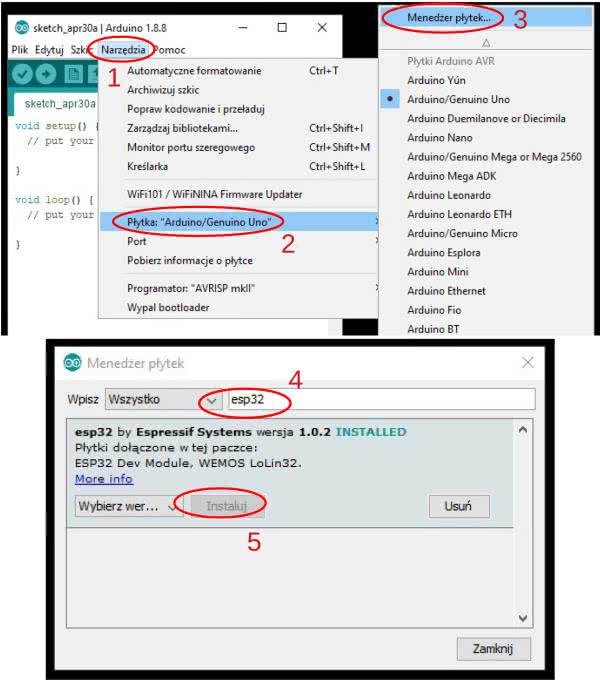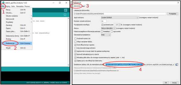 Środowisko Arduino wymaga krótkiego przygotowania do pracy z układem ESP32. Po pierwsze musimy dodać adres URL do menedżera płytek. W polu wskazanym na rysunku 3 należy wstawić treść znajdującą się pod adresem: http://bit.ly/30tirSn.
